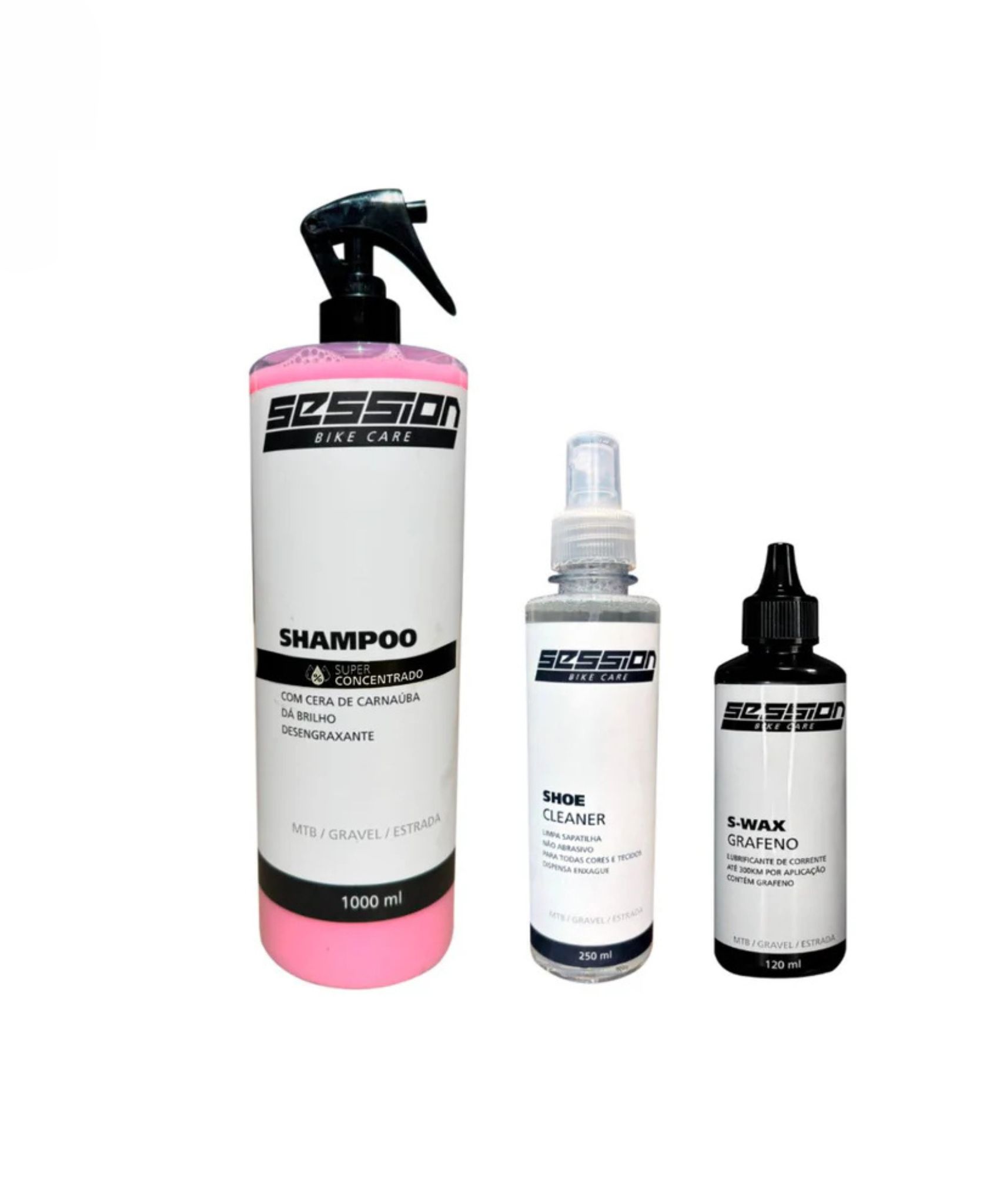 O Shampoo Desengraxante garante limpeza profunda e segura do quadro e da transmissão. O Shoe Cleaner cuida dos seus calçados e acessórios sem agredir os materiais. Já a Cera de Corrente S-Wax com Grafeno entrega lubrificação avançada, redução de atrito e maior durabilidade da transmissão.